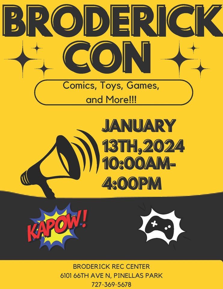 Join the fun on January 13, 2024 at the Broderick Rec Center located at 6101 66th Ave N, Pinellas Park, FL 33781 for a day of fun and excitement! This free neighborhood comic convention will feature a variety of activities and attractions that are sure to delight comic book fans of all ages.