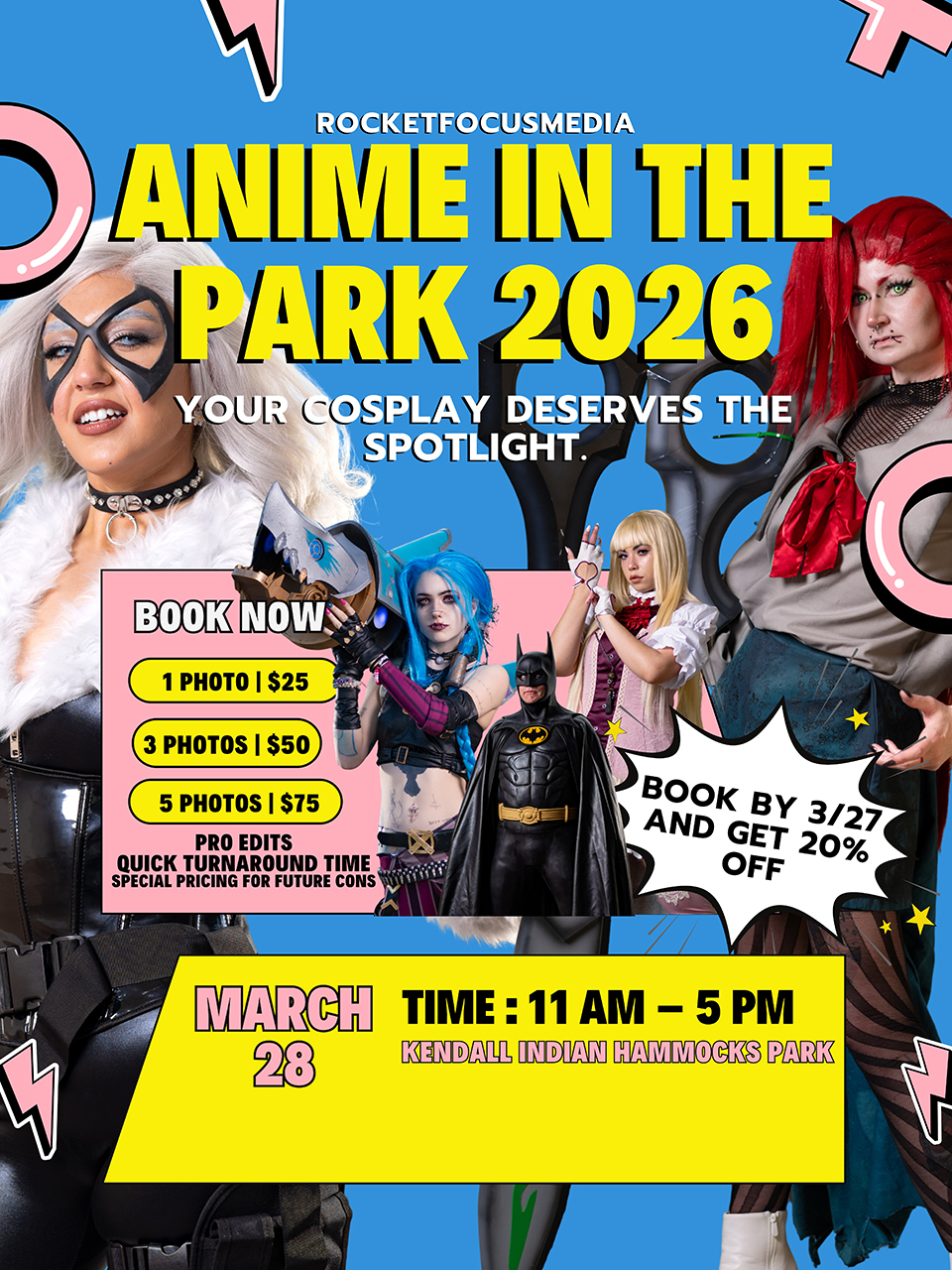 Anime in the Park happens Saturday, March 28, 2026 from 11:00 AM to 6:00 PM at beautiful Kendall Indian Hammocks Park, 11395 SW 79th St, Miami, FL 33173.